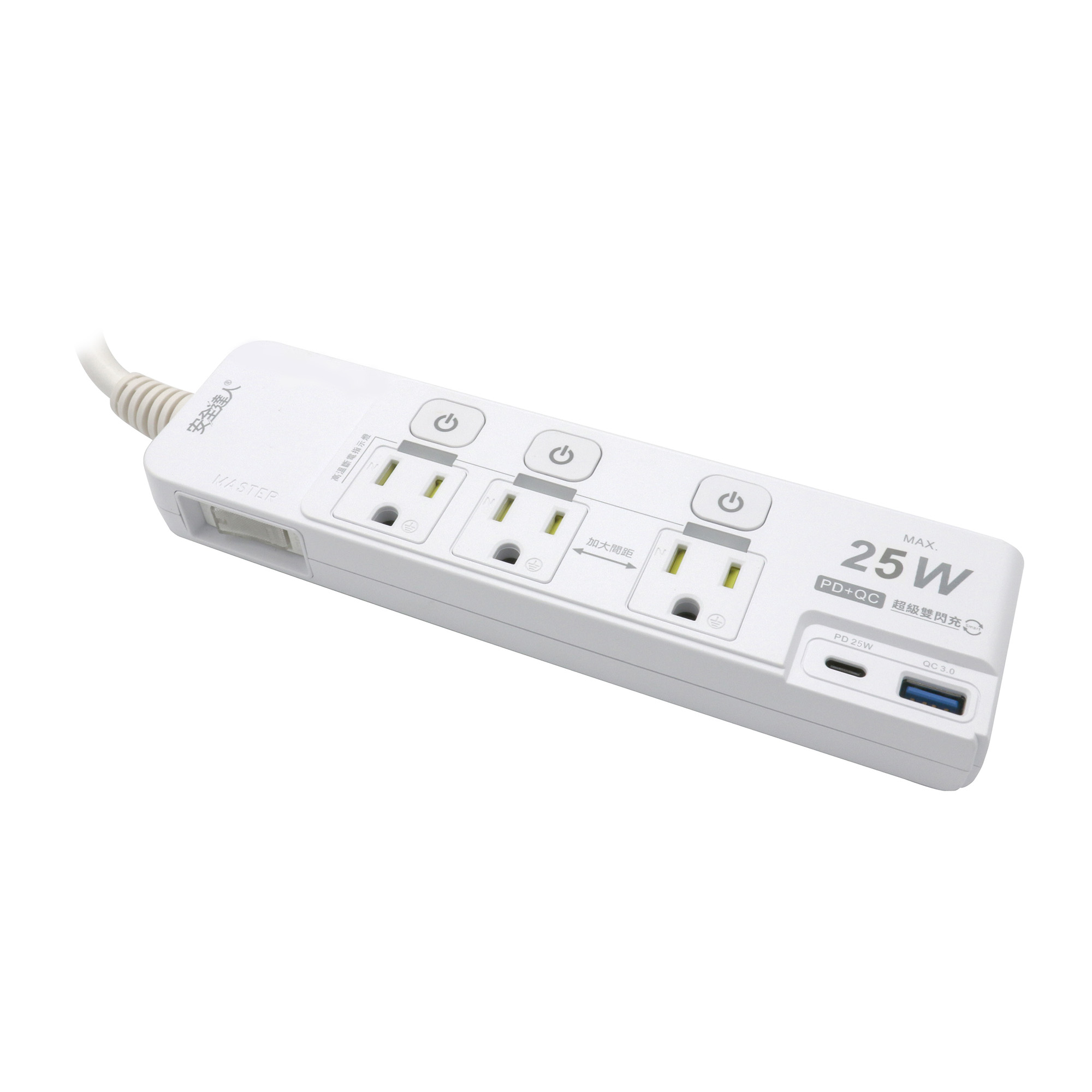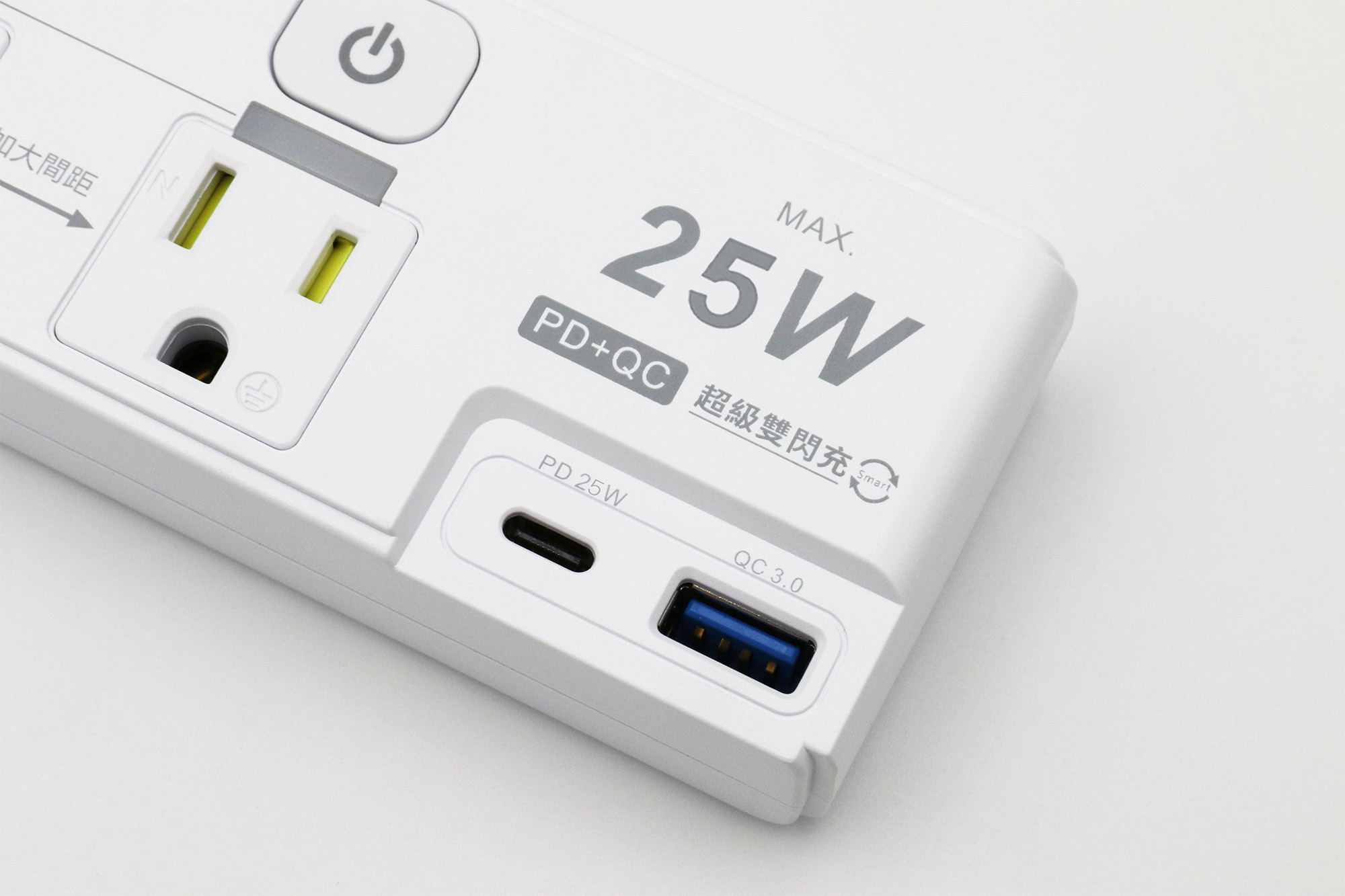 ◆產品規格:3口,3孔,PD25W(Type-C)+QC3.0(Type-A)
